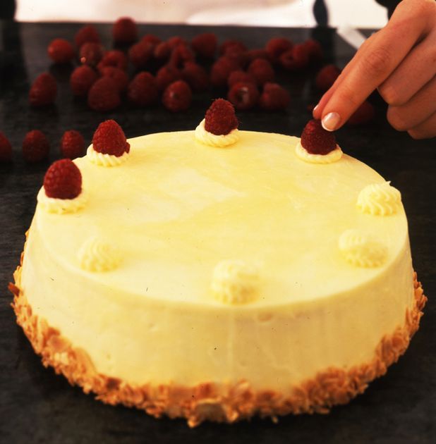 Decorate with buttercream rosettes. Place a raspberry in the center of each rosette.