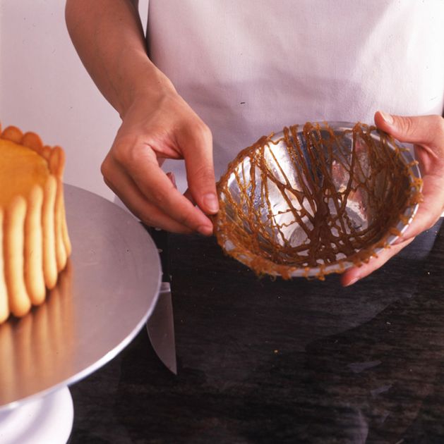 Small cakes and other desserts look dramatic when covered with a little caramel dome.