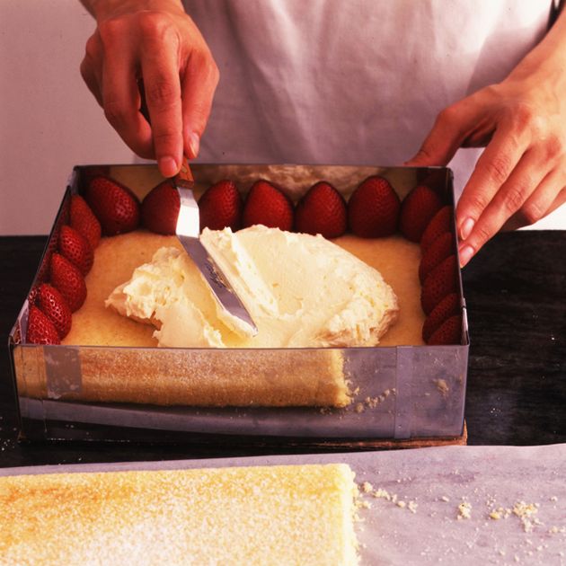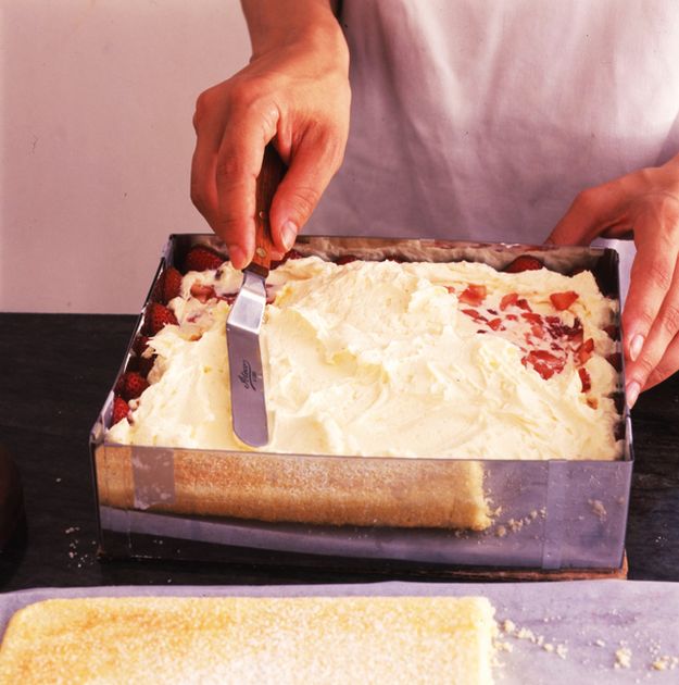 Spread the filling almost to the height of the strawberries. Push it firmly against the strawberries so there are no gaps when you unmold the cake.