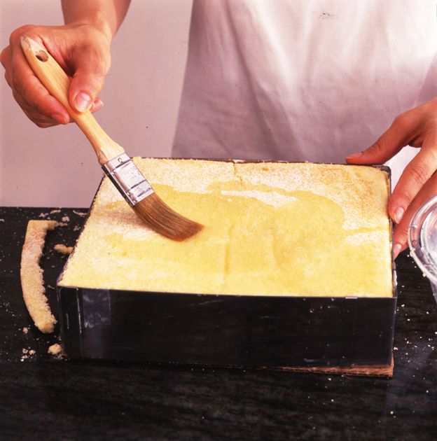 Put the cardboard in the cake square and gently place a cake layer on the cardboard. Brush the cake with simple syrup.
