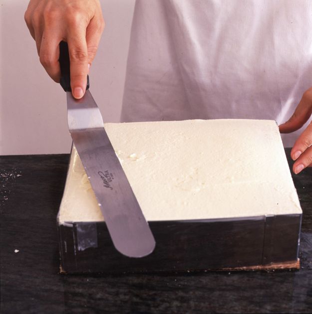Spread the top of the cake with a thin layer of filling to hold the marzipan in place. Run the spatula along the sides of the mold so the filling comes evenly to the edge.