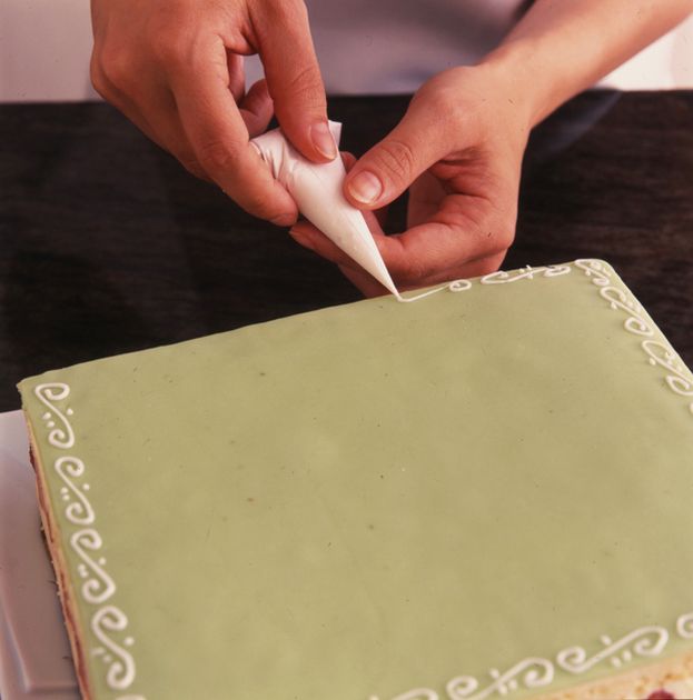 Decorate with royal icing using a paper cone and the 2 reserved strawberries.
