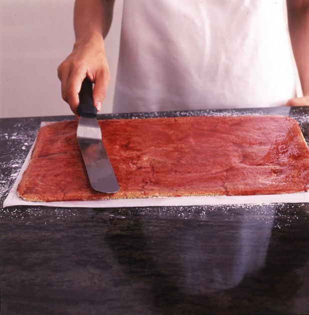 Brush the cake with the simple syrup and spread over a ½-inch layer of crème mousseline.