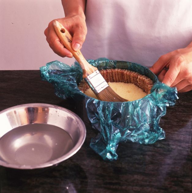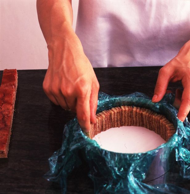 Arrange the cake squares, on their sides, along the inside of a cake ring lined with a cardboard disk and plastic wrap.