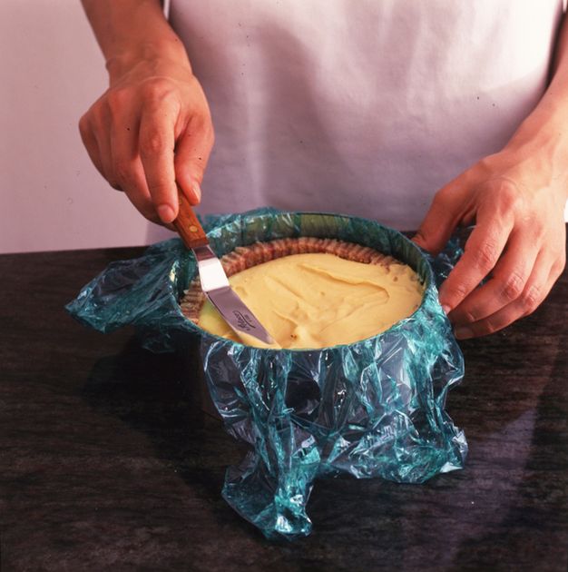 Place a cake disk, slightly smaller than the cardboard ring, inside the lined cake ring.