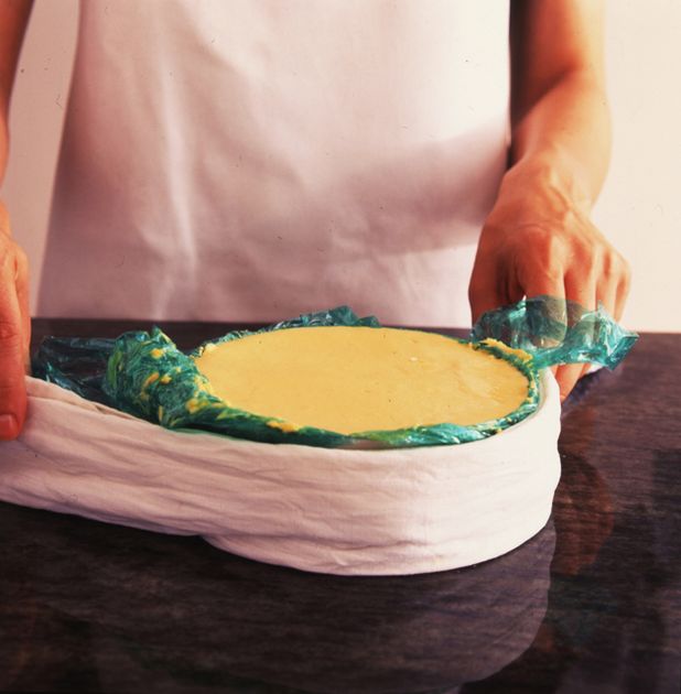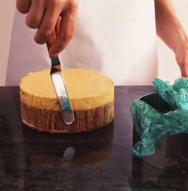 Fill the cake ring with the rest of the peach crème mousseline and smooth off the top. Chill for at least 3 hours.