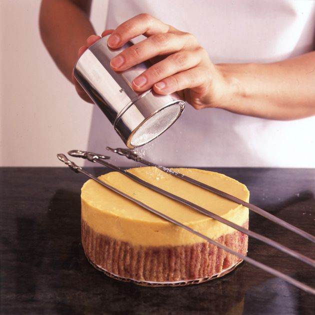 Shortly before serving, arrange skewers or chopsticks on top of the cake. Sprinkle with confectioners’ sugar.