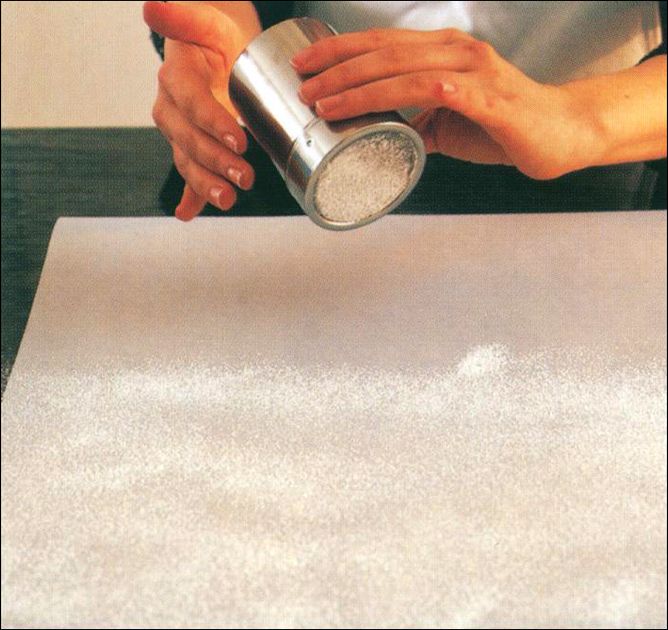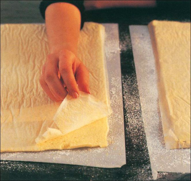 - While the cake is baking, sprinkle a sheet of parchment paper with confectioners’ sugar to keep the cake from sticking to the work surface.