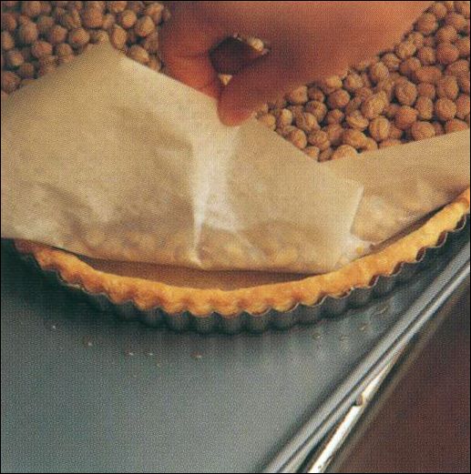 Place a sheet of parchment paper over the dough-lined pan and pour in enough dried beans to come up the sides.