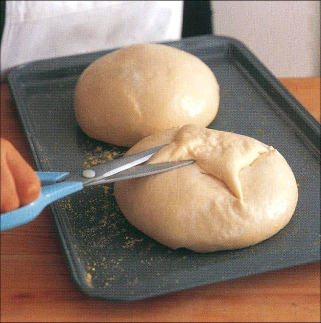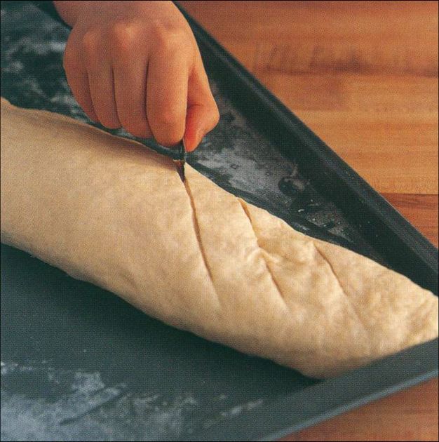 Scoring a bâtard-shaped loaf. Score with a rapid, single movement with the blade inserted about ½ inch into the dough.