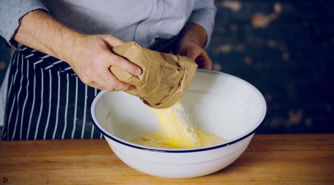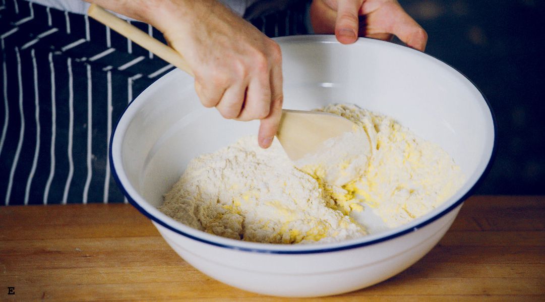 Add salt, yeast, and flour and combine, reserving about a sixth of your flour on one side of the bowl (D–E).