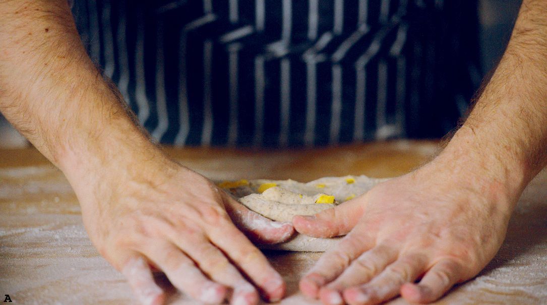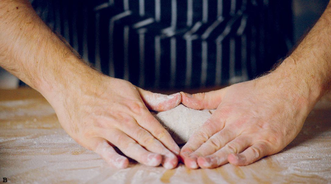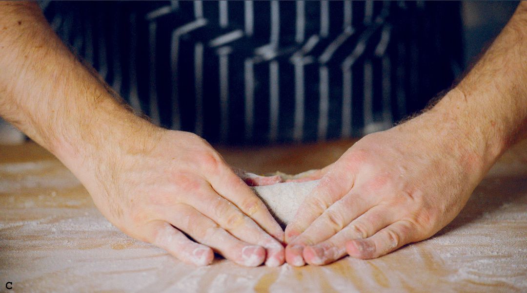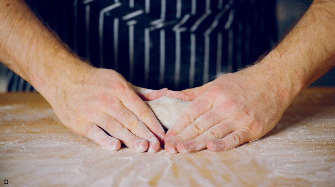 Roll it toward you and then push down slightly, tucking the fold under the roll (B–D). Repeat this rolling and pressing motion 3 to 4 times down the length of the dough.