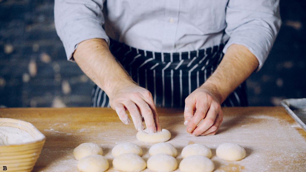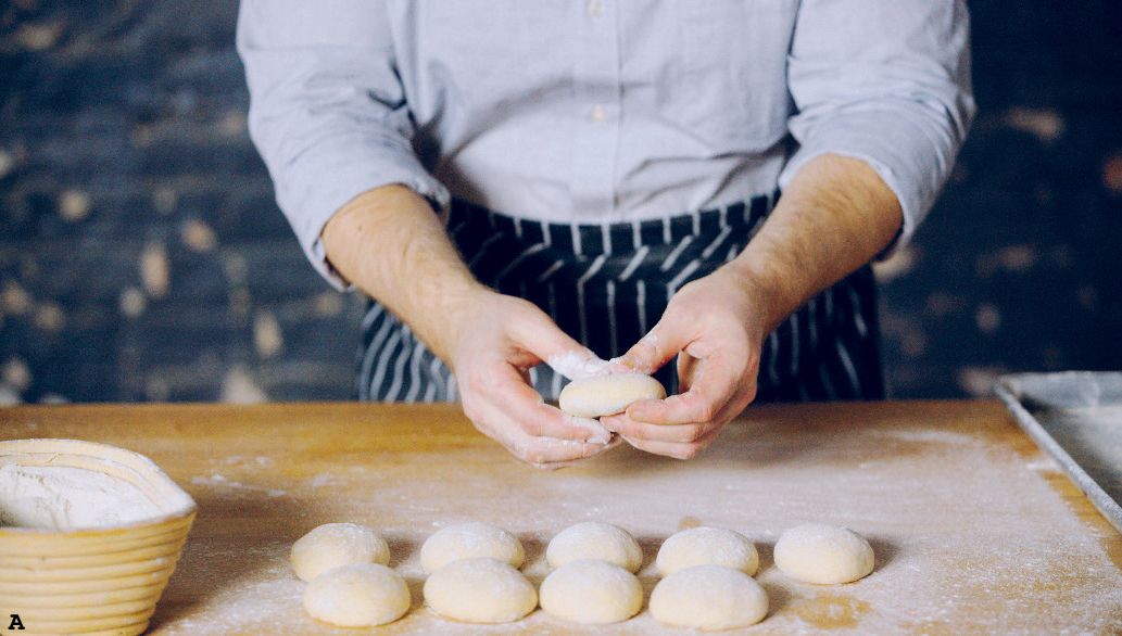 Press each ball of dough into a disk about 2½ inches (6.5 cm) in diameter. Working with one disk at a time, flour both sides, and then use two fingers to make a depression in the center (A–B).