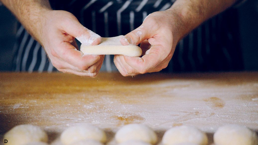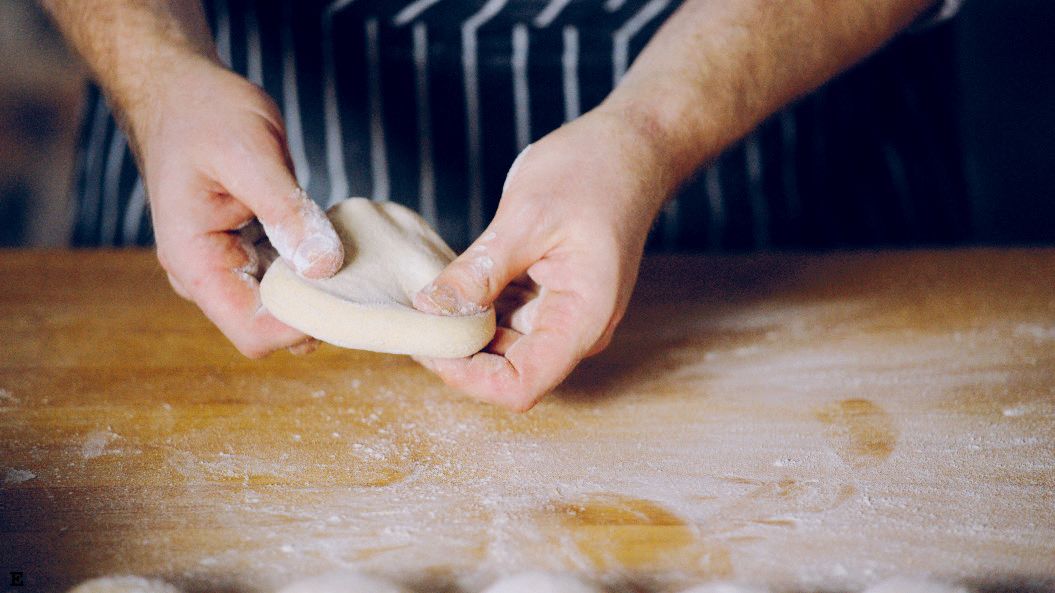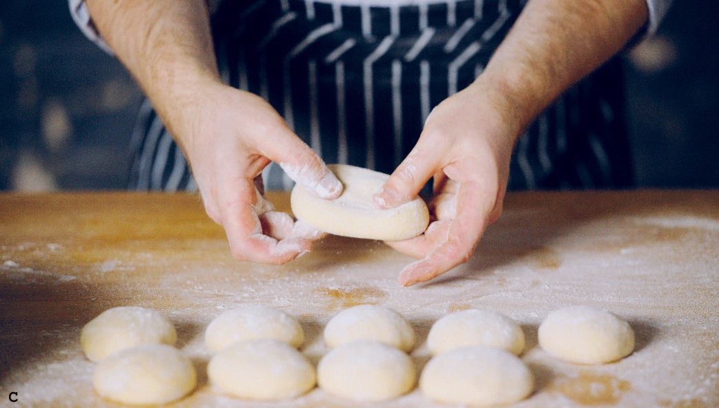 Using your thumb and the first two fingers of both hands, pick up a disk and carefully rotate the dough, stretching it in the same way you stretch a pizza dough until the indentation or well in the center is 2½ to 3 inches (6.5 to 8 cm) in diameter (C–E). Repeat with the remaining dough.