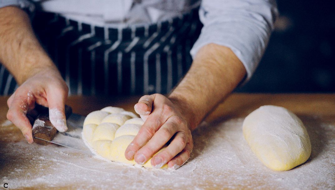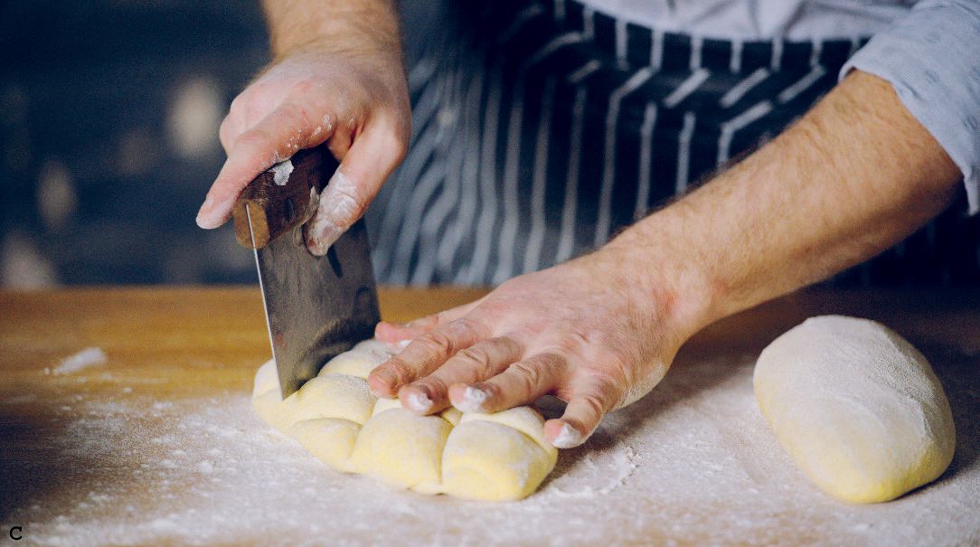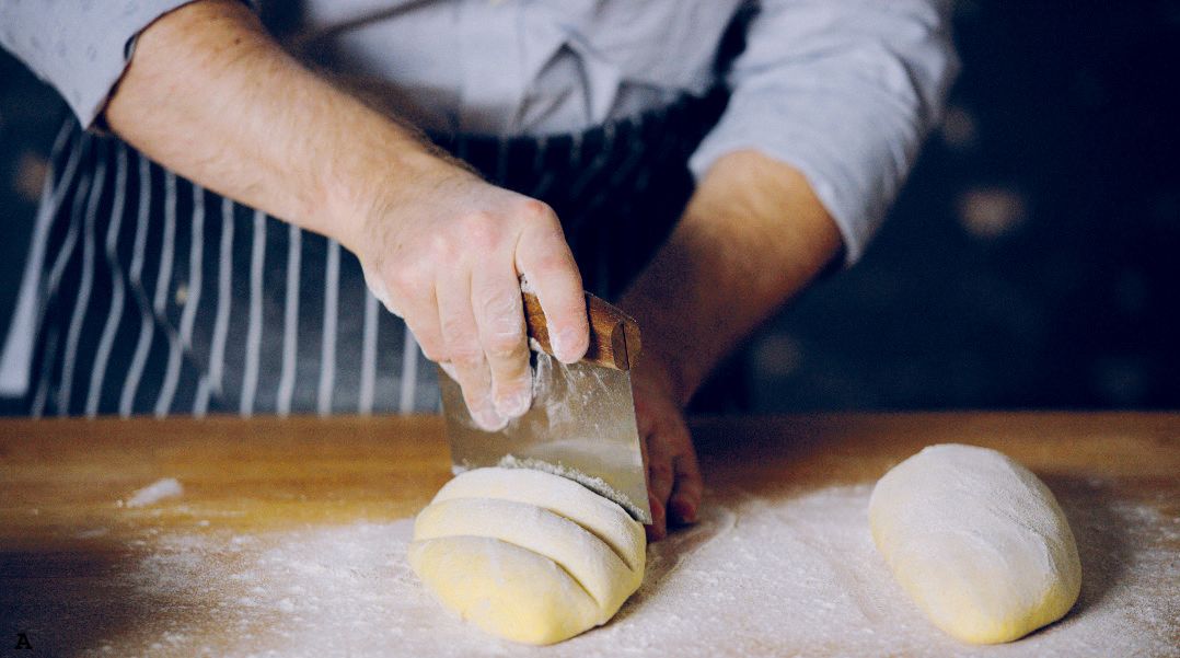 Using a bench scraper, make 3 to 5 cuts on the diagonal down the loaf (A). Then make 3 to 5 cuts in the opposite direction, crossing the first set of cuts, to make diamonds (B).