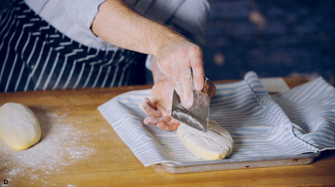 Using a bench scraper, gently flip the loaf onto a floured linen (C–D).