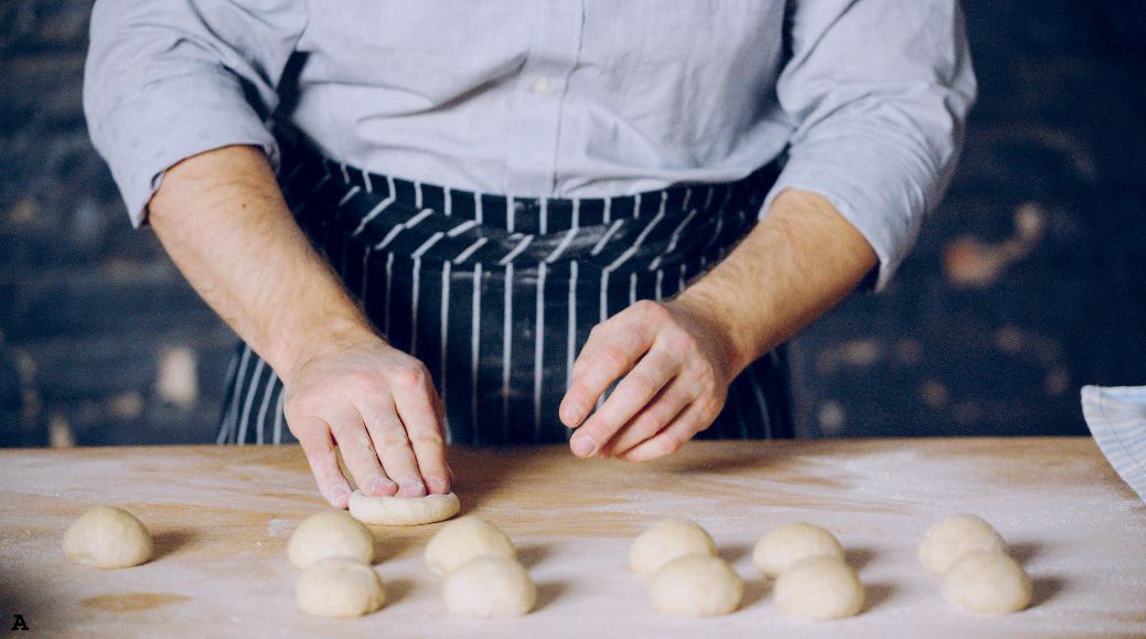 After the dough has been shaped into a ball and rested for about 5 minutes, press into disks about 3 inches (8 cm) in diameter (A–B).