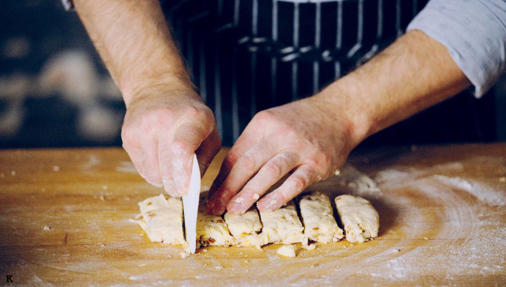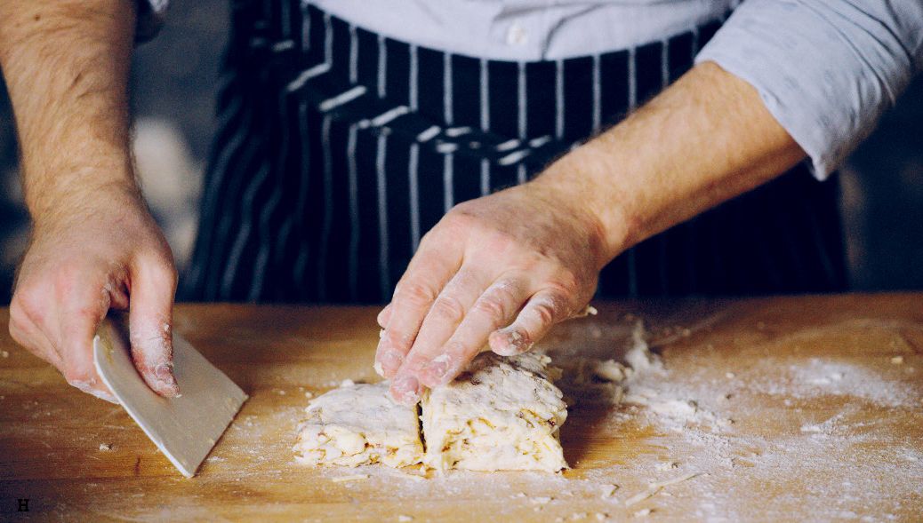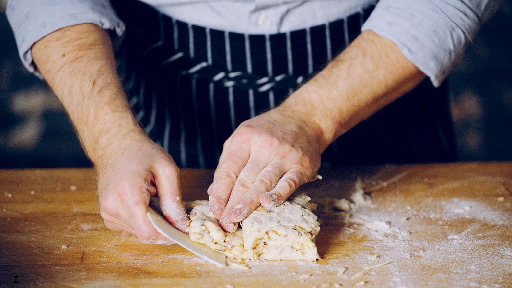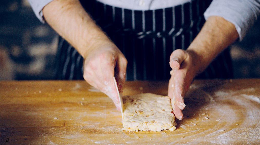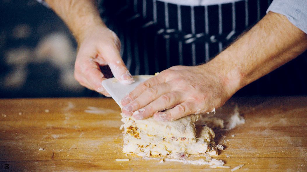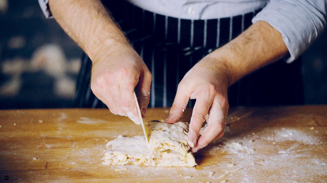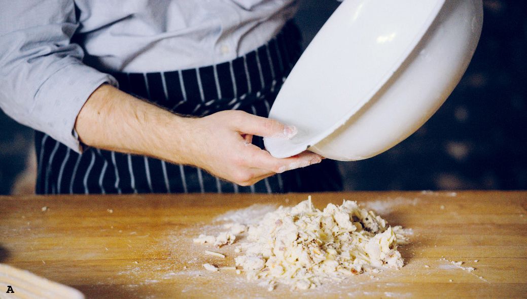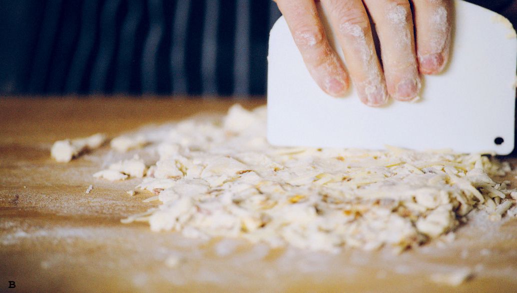 Empty the scone dough onto a floured surface. Bring together then flatten with a plastic scraper (A-B).