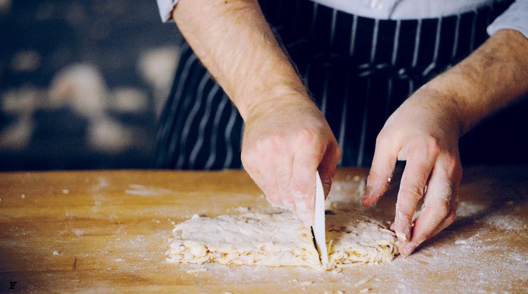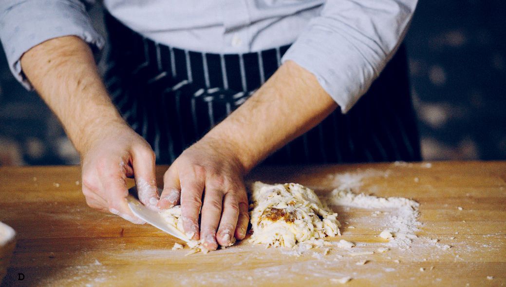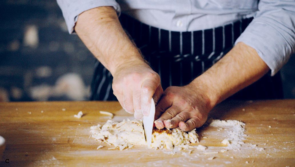 Cut the dough in half and place one half on top of the other (C-E).