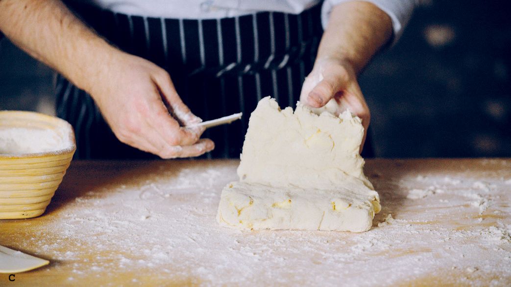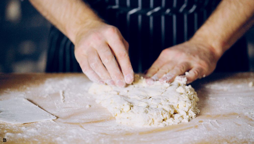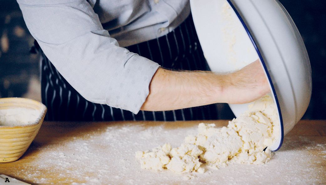 Using the plastic bowl scraper, turn the dough out onto the work surface. Bring together then flatten with a plastic scraper (A-B).