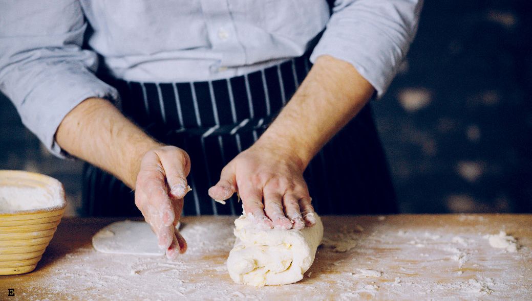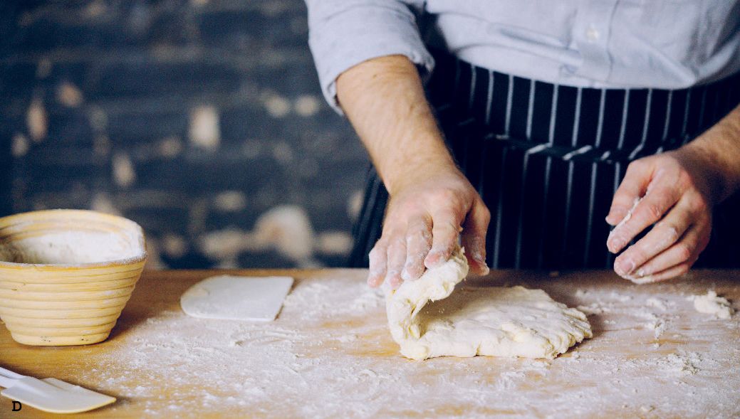 Using the scraper and your hands, fold the dough into thirds (D-E). Repeat the folding until the dough is firm, but not tough.