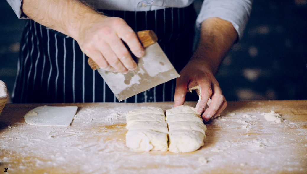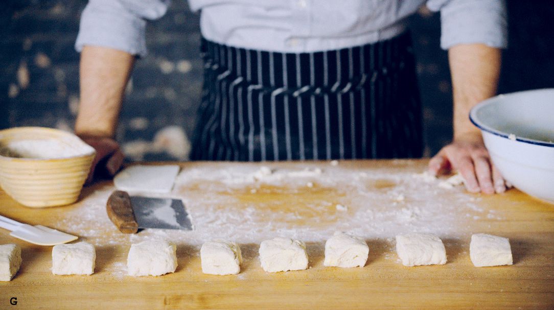 Press the dough into a 4 by 12-inch (10 by 30 cm) rectangle about 1 inch (2.5 cm) thick. Using a bench scraper, cut the dough into eight equal squares (two rows of four) (F-G).