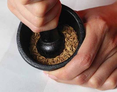 Crushing spices such as carom seeds and dried fenugreek leaves can be done using a pestle and mortar or a rolling pin. Carom seeds crush well in a pestle and mortar and although dried fenugreek leaves can also be crushed in this way, it is preferable to use the palm of your hands to crush them as they are being added to the dish. Many of the Indian spices can be crushed using a pestle and mortar, apart from a few whole spices which are harder to break down.