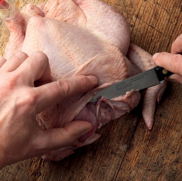 First remove the wishbone. Lay the bird on its back on a board. Pull back the flap of skin at the neck end and find the tip of the wishbone with a sharp small knife. Run the knife along the inside of the bone on both sides, then on the outside. Cut deeply enough to free the bone and make it clearly visible. Take care not to cut into the breast meat. Run the knife just behind the wishbone, then use your fingers to lift and twist it free.