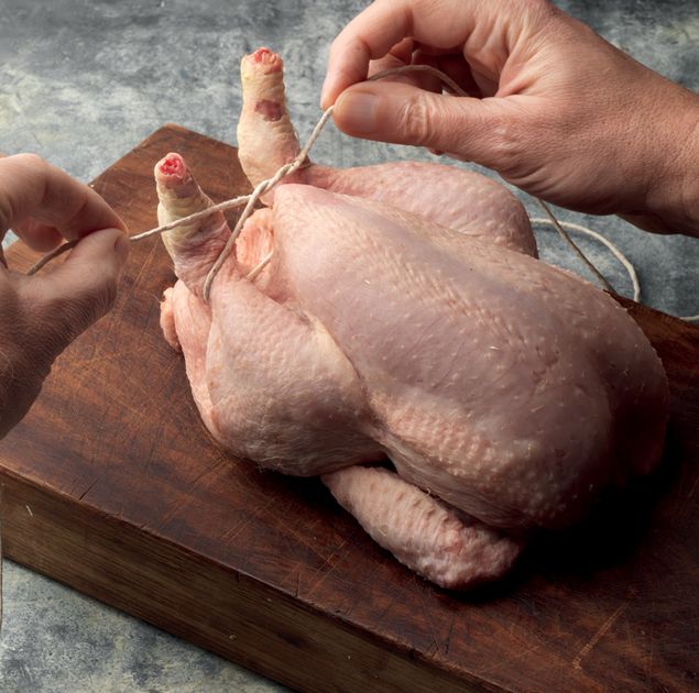 Cut a piece of kitchen string about 4-5 times the length of the bird, then loop it around the narrowest part of each leg, pulling the ends tightly to bind the legs together.