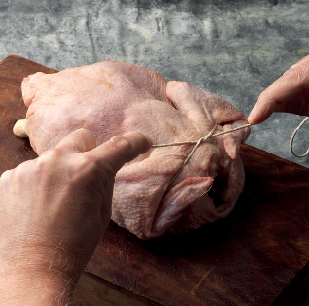 Take the string around the outside of the wings, flip the bird onto its breast and draw up the nub at the neck. Cross the ends of the string over the nub.