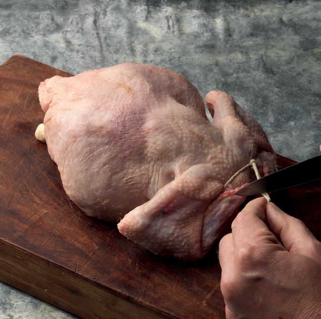 Holding the ends of the string and the nub, flip the bird onto its back again. Tie the ends of the string together into a tight knot at the nub of the neck.