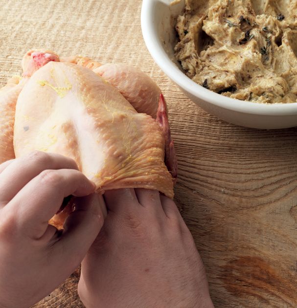 Prepare your favourite flavoured butter. Starting at the neck end of your bird, carefully ease your fingers under the breast skin (taking care not to split the skin as you go) to separate the skin from the flesh.