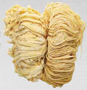 Chinese wheat noodles may be round or flat, thin or thick, and plain white or tinted yellow with alkaline water and/or eggs. They include mee pok (flat noodles) (left), mee kia (fine noodles) (right), Hokkien noodles (thick round noodles, usually sold par-cooked), ban mian (thick flat noodles, fresh or dried), yee mein (deep-fried and dried noodles, often cooked for birthdays and other auspicious occasions) and mee sua (very fine dried noodles).