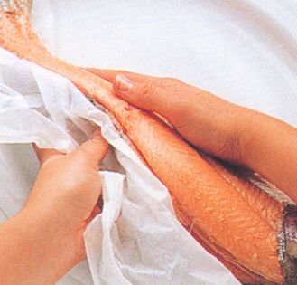 Place a serving plate under one side of the greaseproof paper and flip the salmon over onto the plate, using the paper to help you. Remove the rest of the skin. Remove the head if preferred.