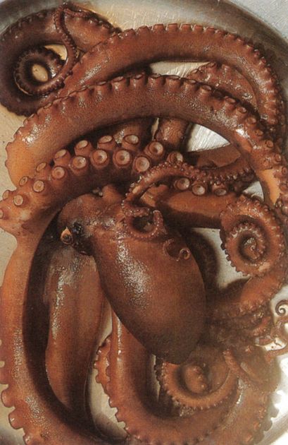 There is a famous stand in the middle of the Vucceria market in Palermo, Sicily where you can eat freshly cooked and locally caught octopus from an old aluminium pot. Into the boiling water goes the fresh, creamy coloured octopus and after a few minutes out it comes, extremely tender and an appetising pinky-red. It is cut up on the stall so that it can be eaten straight away. It does not need to be accompanied by any sauces or spices, nature has already provided all the essential ingredients.