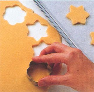 Remove the baking paper and cut out the biscuits using shaped cutters. Place on the prepared baking tray.