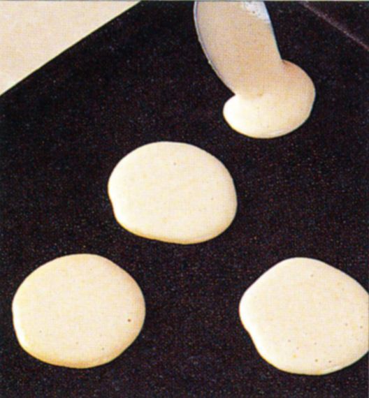 Make the batter (see box). Place tablespoons of batter on the hot griddle, spacing them well apart.