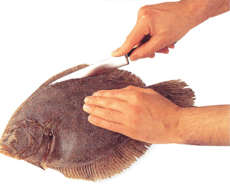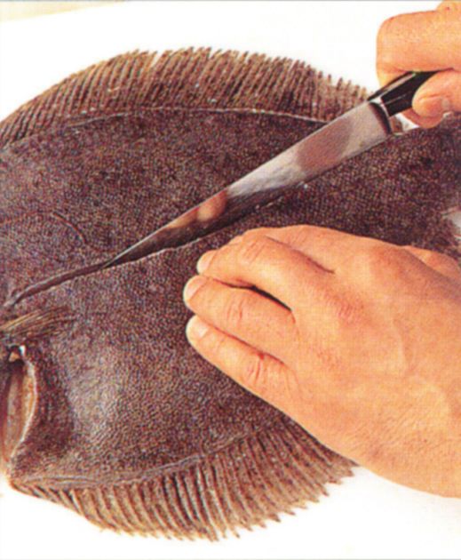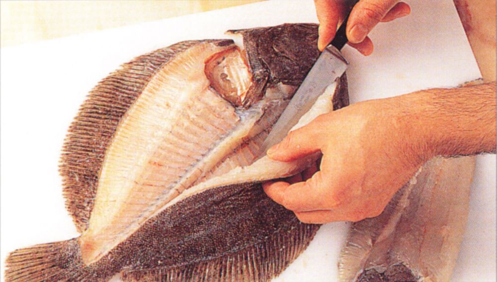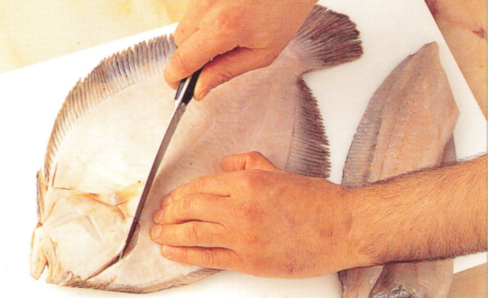 Depending on its size, a flat fish yields two or four fillets. Whether you are going to skin the fillets or not, you should always trim and scale the fish before filleting. Here a large brill is separated into four fillets.
