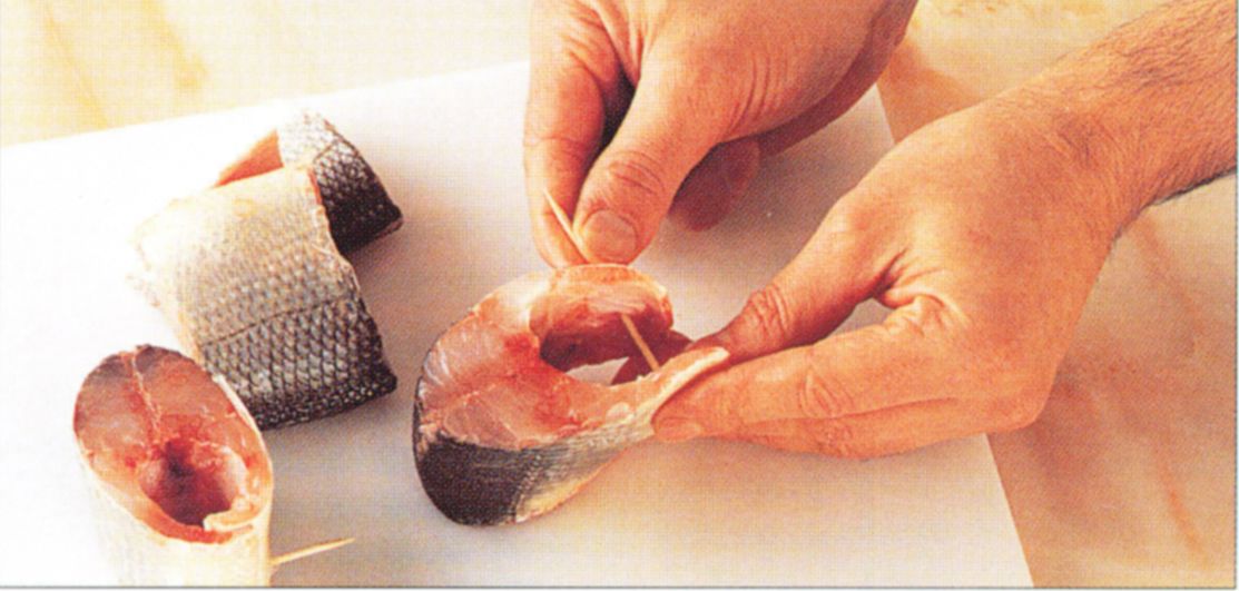 Fold the ends of each steak in towards the centre; secure the ends with a wooden cocktail stick to keep the ends from curling during cooking. The steaks are now ready to cook and they can be served with or without the backbone.