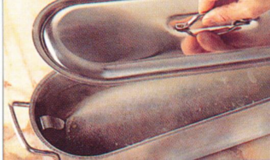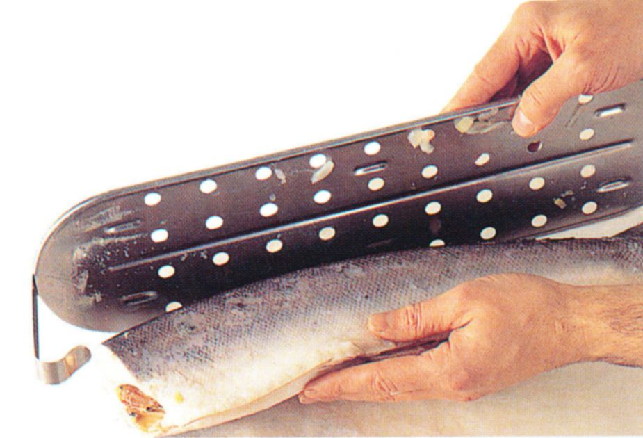 Whole fish with the head on, or off such as the salmon used here, must be trimmed, scaled and gutted before cooking. Stovetop poaching affords you most control. A fish kettle is made for this task - the entire fish fits comfortably on a rack in the cooking vessel, with enough room for the poaching liquid to cover it.