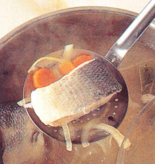 Lower the fish into a pan of simmering court bouillon. Bring back to a simmer and cover. Poach, allowing 5-10 minutes for fillets and 10-15 minutes for steaks, until opaque throughout.