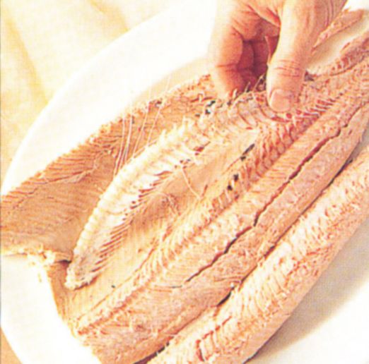 Lift out the backbone, bringing the rib bones out with it, if necessary, cutting it from the tail end of the fish with kitchen scissors.