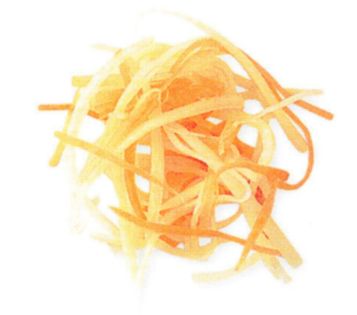 Mooli julienne Cut a peeled mooli crosswise into thin slices, then into julienne strips. Keep crisp in iced water, then pat dry.