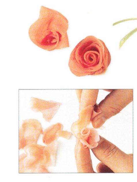 Pickled ginger rose Roll up one slice to form the centre, then wrap 3 more overlapping slices around the first to form “petals”.