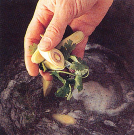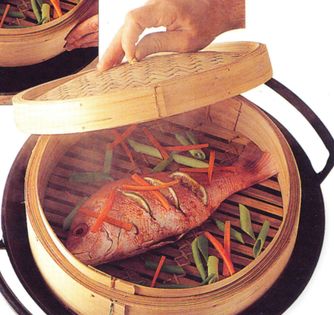 A woven basket can be placed in a wok over simmering broth. The aromatic steam helps flavour the fish, while herbs, spices and other seasonings can be added to the fish itself. Steaming preserves the attractive colour of fish, such as the red snapper shown here.