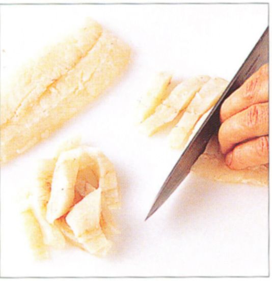 Cut the skinned fish fillets into 1-cm strips, working across the grain and using a chef’s knife.