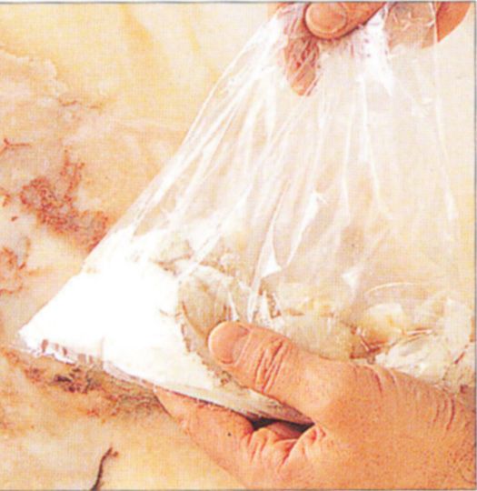 Put the strips of fish in a plastic bag containing seasoned flour. Twist the top to seal, and shake to coat evenly.
