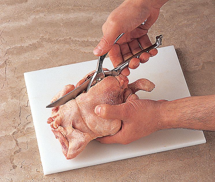 Tuck under the wings and remove the wishbone. Turn the bird over, cut along each side of the backbone with poultry shears and remove it.