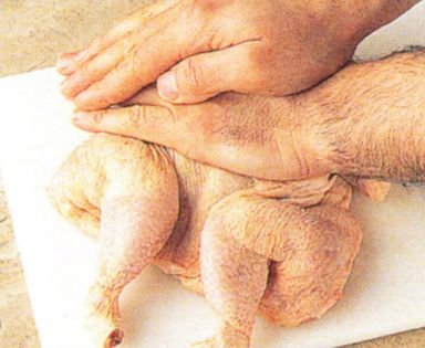 Small birds such as the poussins used here are perfect for barbecuing or grilling. To make them the same thickness throughout so that they cook quickly and evenly, the backbone is removed, then the birds are flattened and secured with metal skewers - called en crapaudine in French.
