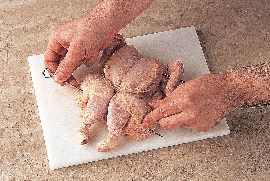 Keeping the bird flat, push a metal skewer through the wings and breast. Push another metal skewer through the thighs.